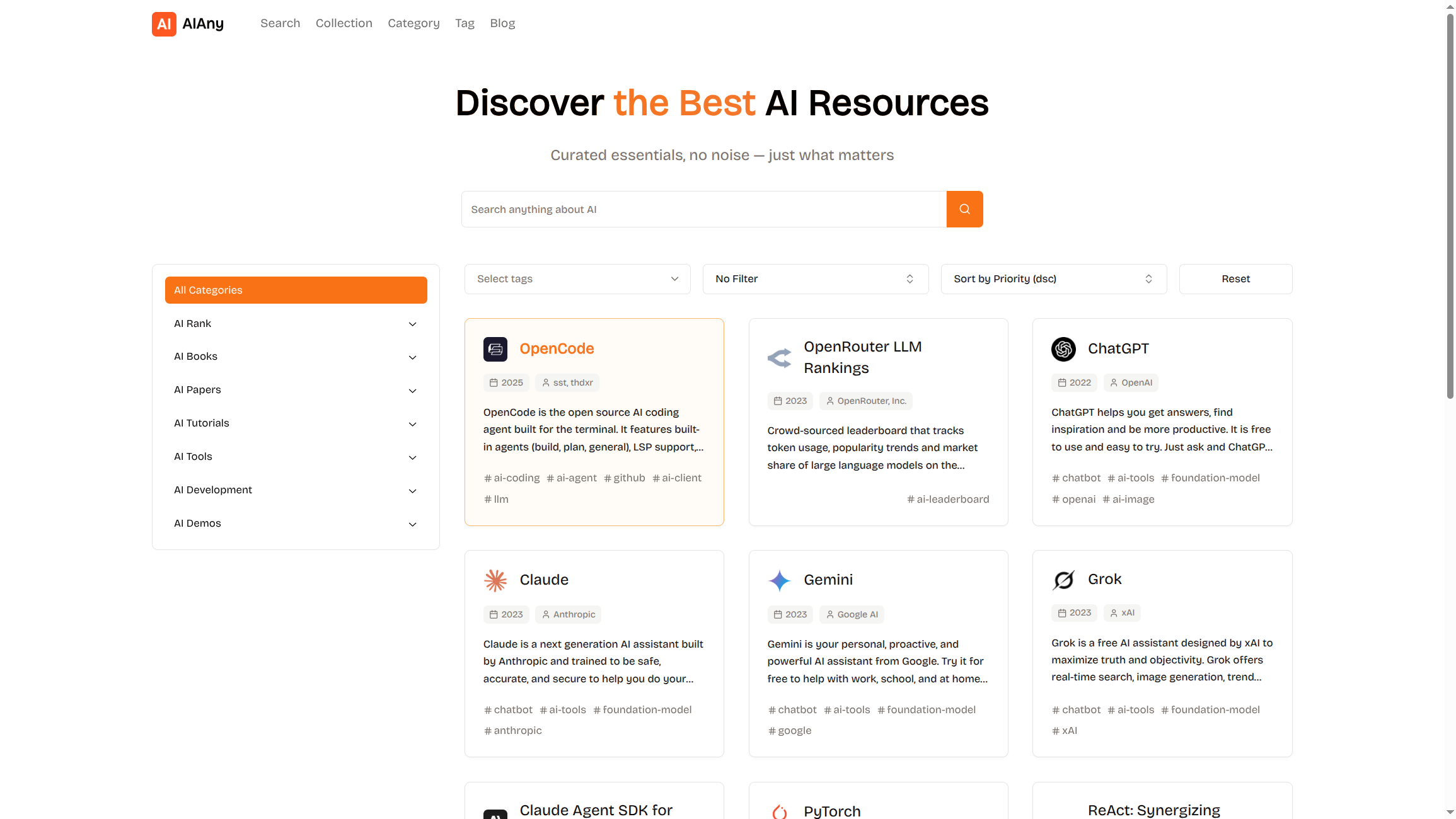 AIAny uses AIRSS to curate the best AI resources — no noise, just what matters. Discover GitHub projects, research papers, tutorials, and tools across 7 major categories.